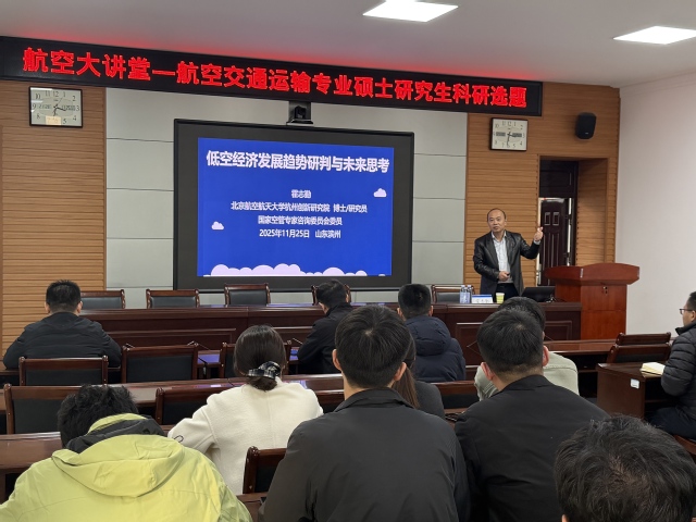 1011月25日,飞行学院在工科楼4-203会议室举行“航空大讲堂”活动。北京航空航天大学杭州创新研究院霍志勤研究员受邀围绕航空交通运输专业硕士研究生科研选题,以“低空经济发展趋势研判与未来思考”为题开展专题报告。报告会由马文来院长主持,全体硕士生导师、在校研究生参加。