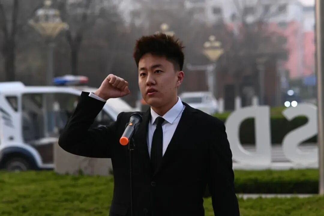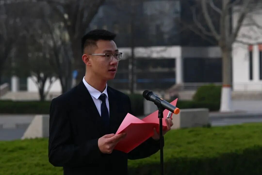 国家奖学金获得者、校“十佳大学生”徐俊杰带领全体同学庄严宣誓,誓言铿锵有力,彰显出新时代青年坚定理想、勇担使命、崇德向善、奋勇争先的青春决心,将仪式氛围推向高潮。