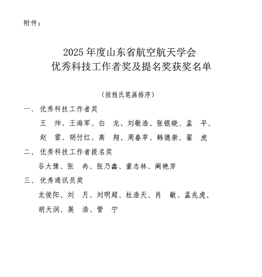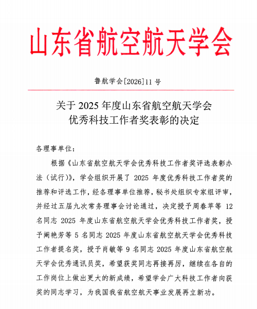 3月9日,山东省航空航天学会公布的《关于2025年度山东省航空航天学会优秀科技工作者奖表彰的决定》中,飞行学院王海军、张银晓老师获评2025年度山东省航空航天学会优秀科技工作者荣誉称号。